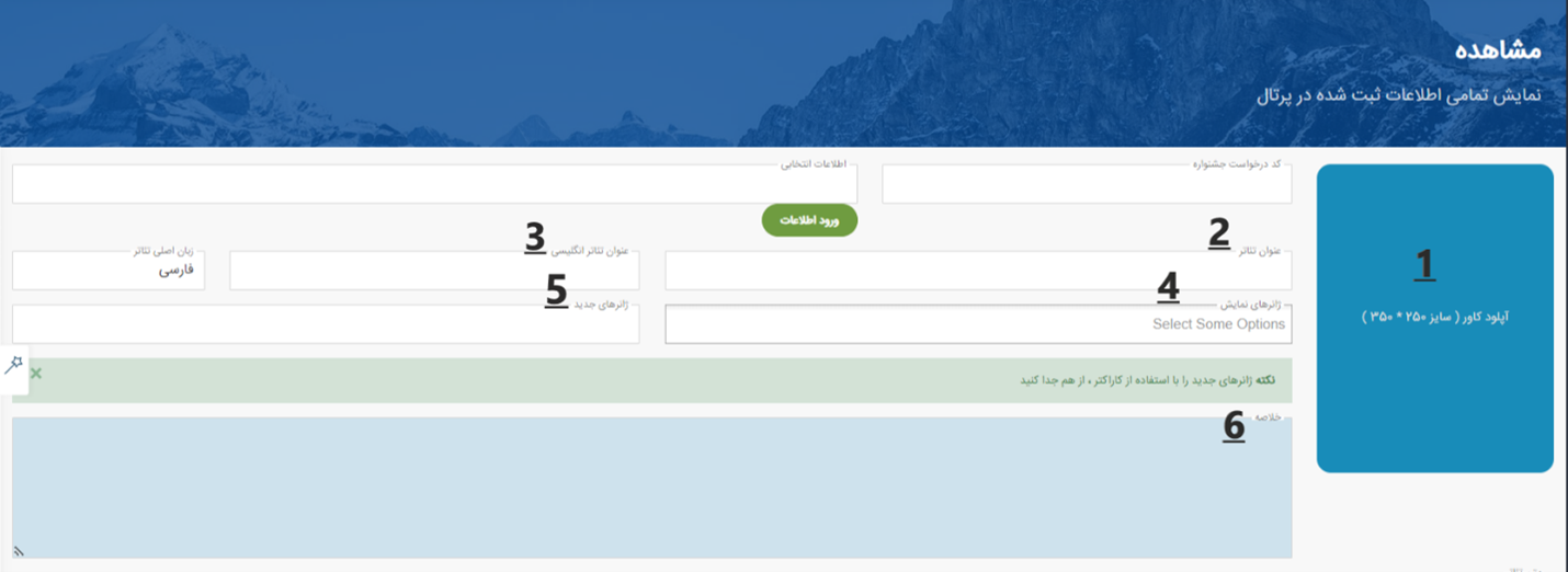 - با کلیک بر گزینه ثبت اطلاعات تئاتر خود را ایجاد کنید.