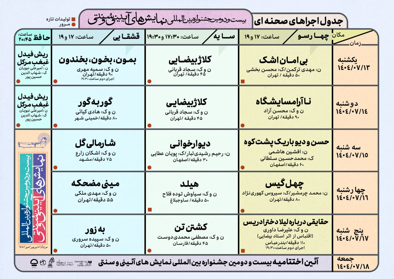 جدول بخش صحنه ای بیست و دومین جشنواره بین المللی نمایش های آئینی و سنتی